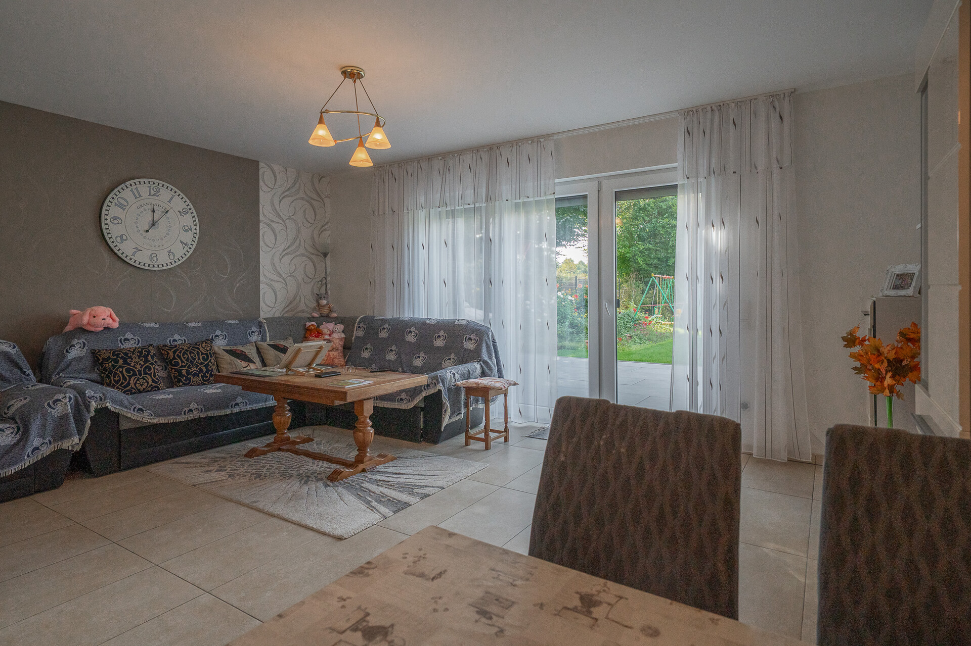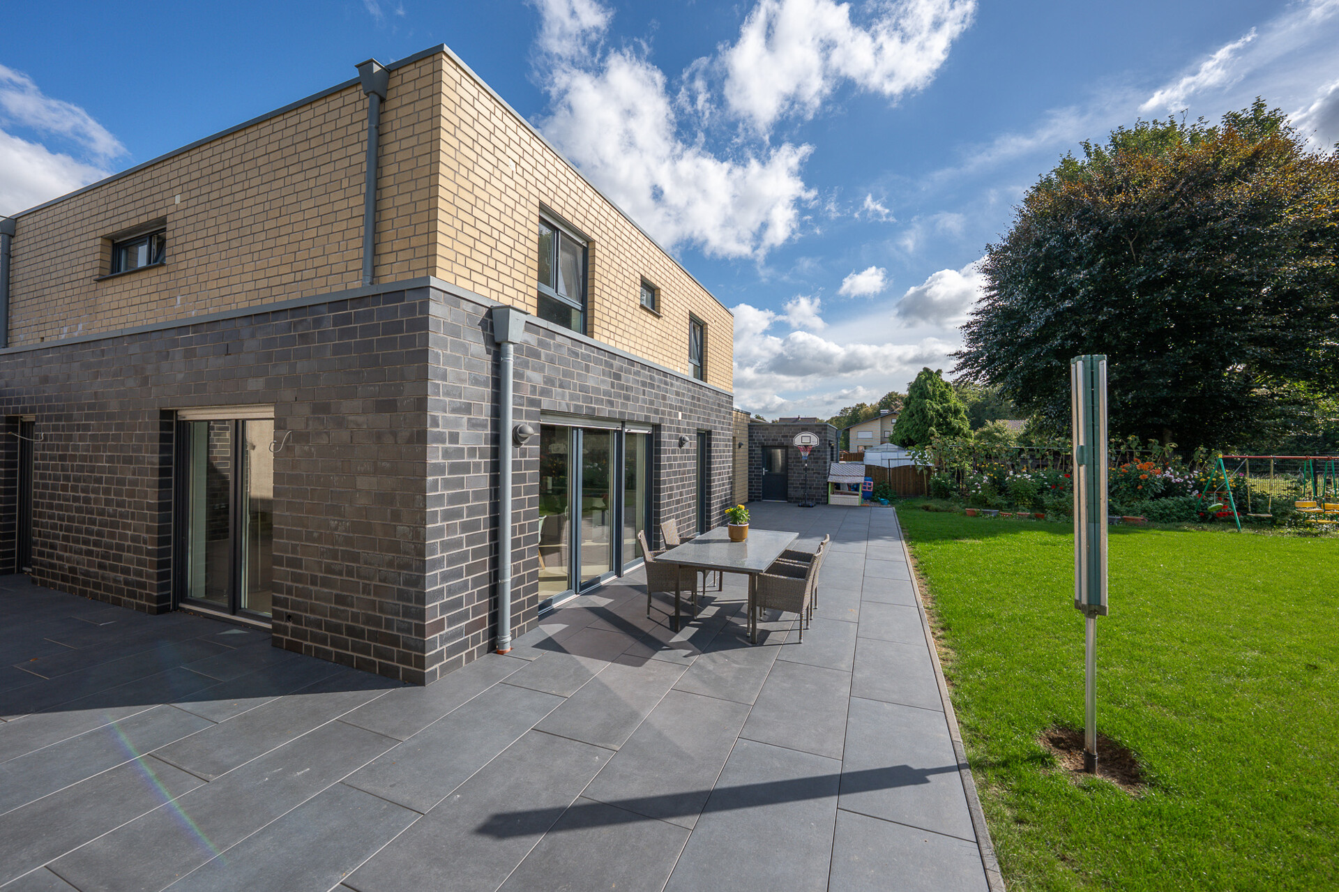Die sonnige Südterrasse öffnet sich direkt zum weitläufigen Garten und wird zum erweiterten Wohnzimmer unter freiem Himmel. Hier kann die Familie unbeschwert spielen, die Natur genießen oder entspannte Stunden verbringen – mit dem Feldblick als ständigem Begleiter, der Weite und Freiheit vermittelt.