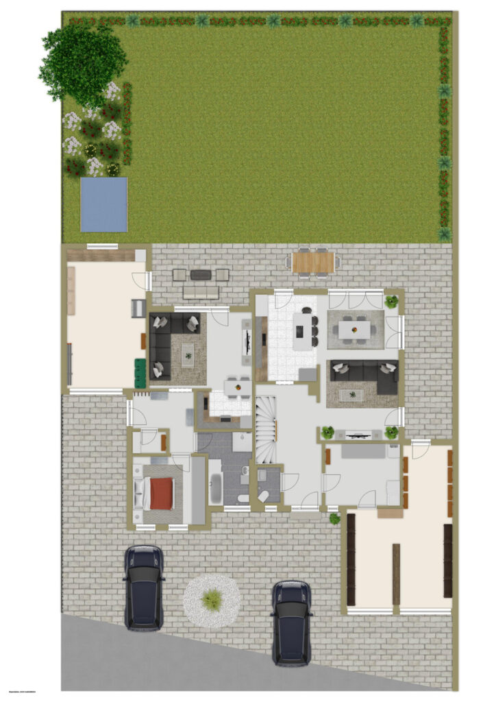 Das Haupthaus empfängt Sie mit einem offenen, lichtdurchfluteten Wohn-/Ess-/Kochbereich, der zum gemeinsamen Leben, Genießen und Entspannen einlädt. Ergänzt durch Gäste-WC, Hauswirtschaftsraum und Doppelgarage, verbindet es durchdachten Komfort mit zeitloser Eleganz. Im Obergeschoss eröffnen drei helle Zimmer und ein großzügiges Tageslichtbad vielseitige Möglichkeiten für Kinder, Gäste oder ein Home-Office. Das Elternschlafzimmer mit Ankleidezimmer und eigenem Bad en Suite wird zum persönlichen Rückzugsort – ein Raum, der Stille und Geborgenheit schenkt.