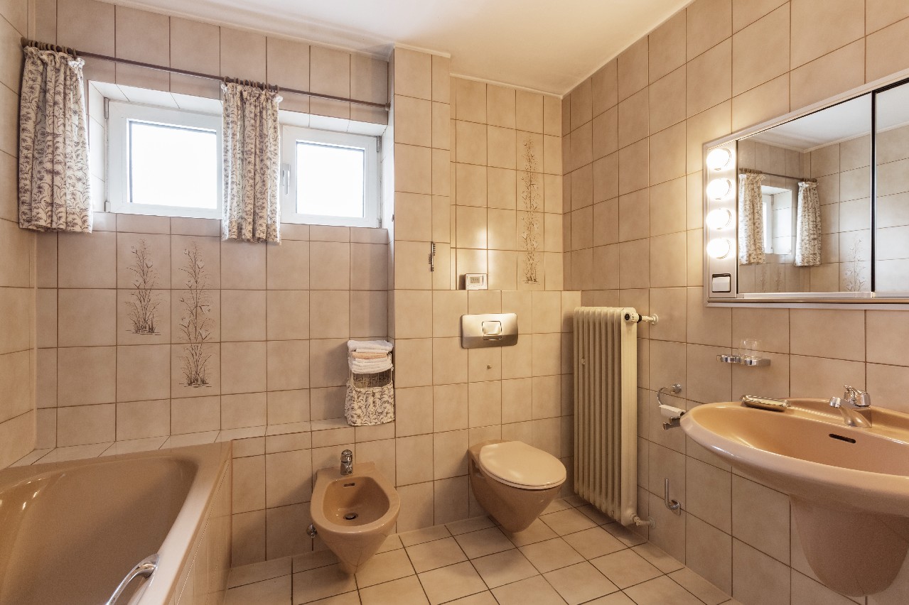Erdgeschoss: Bad mit Wanne, Dusche, Waschbecken, Bidet, WC und Fenster