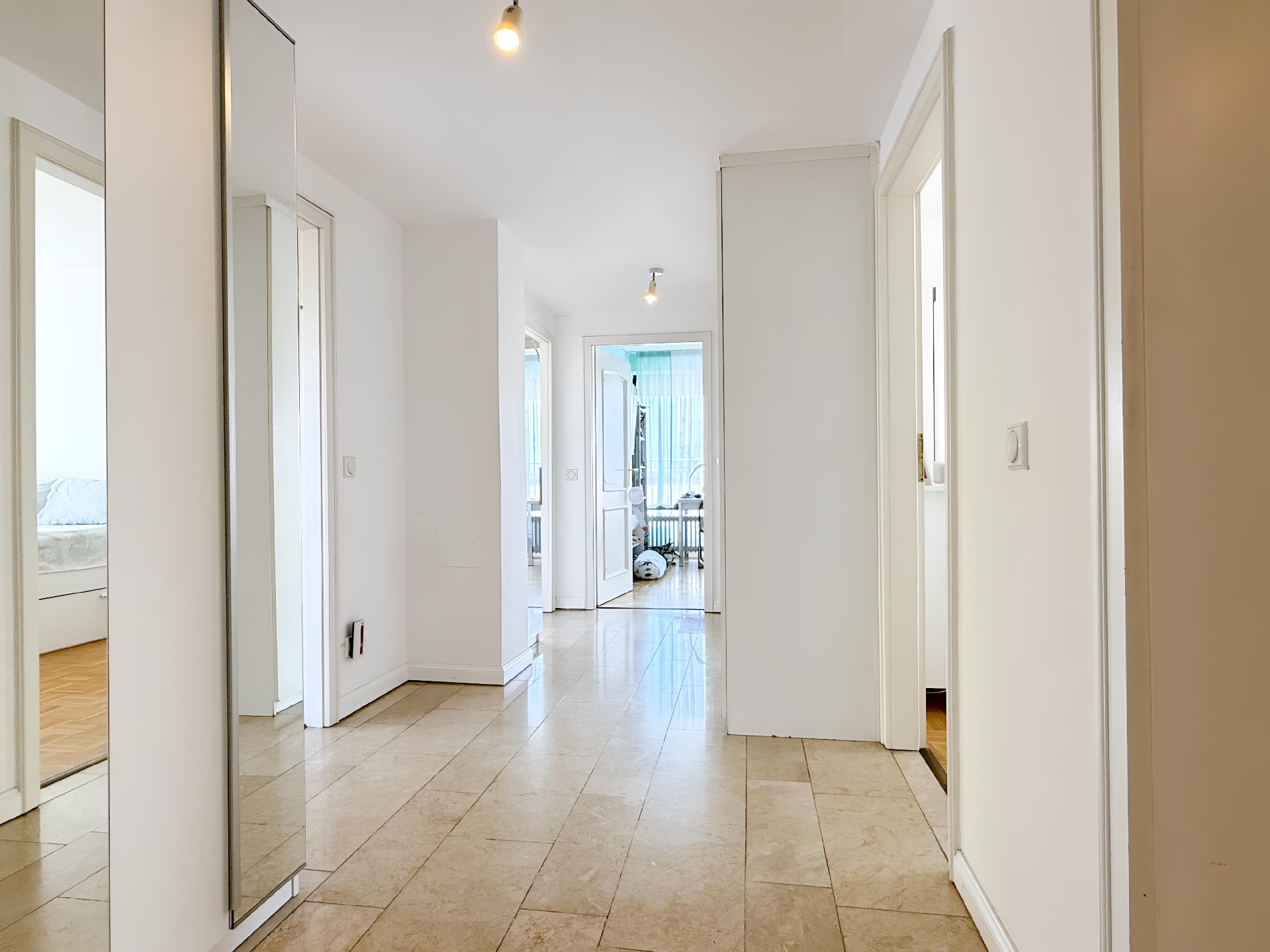 Mit dem Aufzug gelangen Sie in einen hellen Vorflur, welcher Platz zum Einrichten einer Garderobe bietet. Von hier aus führt eine Glastür in die vordere Diele, welche Sie in den linken Teil der Wohnung leitet. Vorbei am Duschbad und am Zugang zum allgemeinen Treppenhaus erreichen Sie vor Kopf den knapp 60 m² großen Wohn- und Essbereich. Dieser bildet das Herzstück der Wohnung und ermöglicht einen unmittelbaren Zugang auf die schöne Sonnenterrasse (ca. 50 m²). Die Küche ist vom Essbereich aus begehbar.