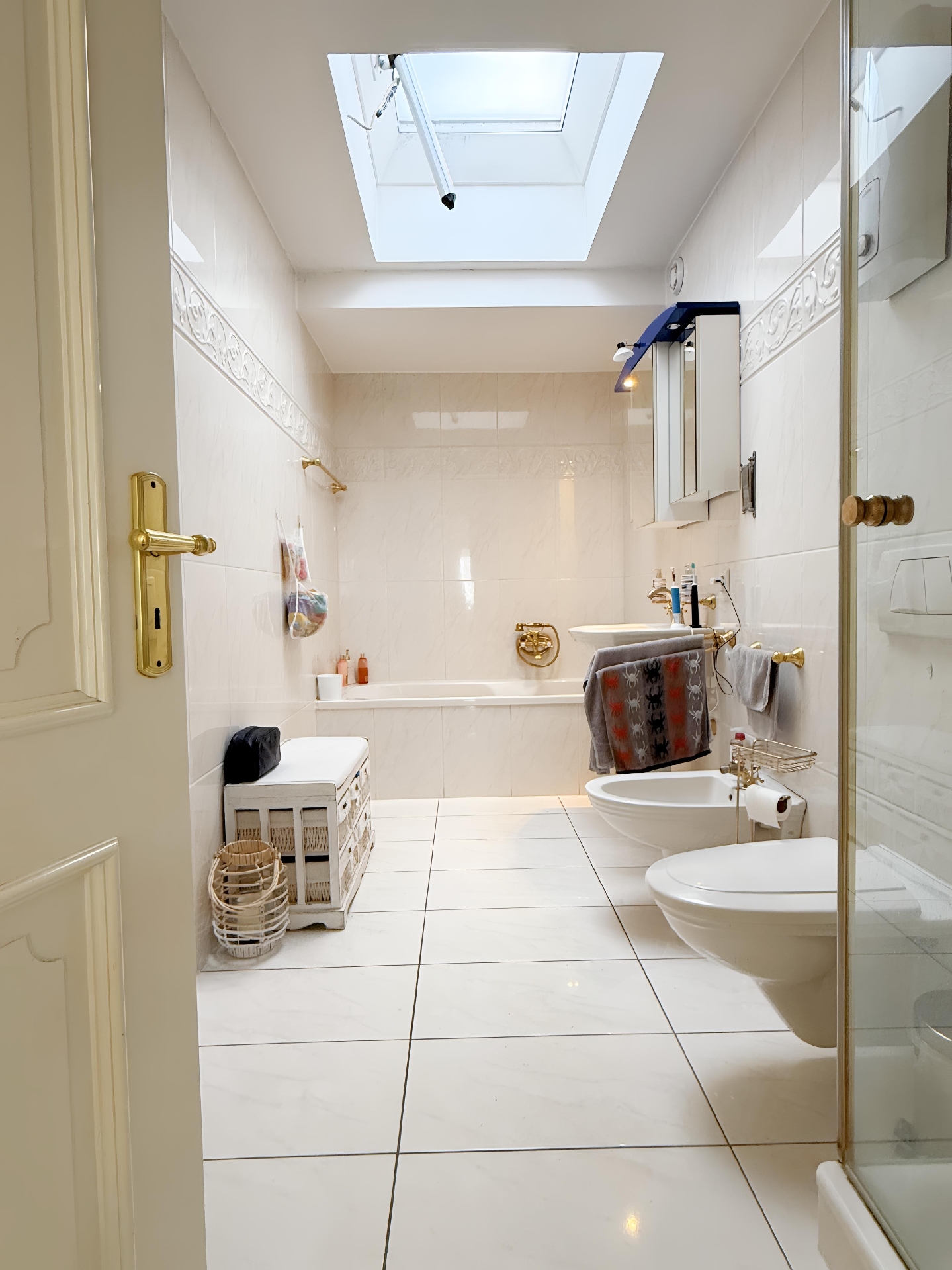 Das Vollbad sowie die vier Schlafzimmer befinden sich in dem vom Wohnraum abgewandten Bereich, auf der rechten Seite der Wohnung. Drei der Zimmer haben einen direkten Zugang zum Balkon und bieten einen schönen Blick in die Baumkronen.
