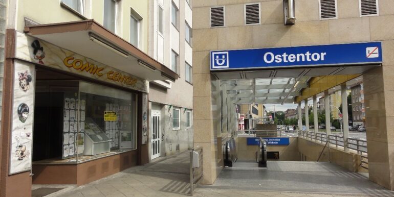 Heller Verkaufsraum, normale Ausstattung, kleiner Abstellraum, WC, große, überdachte Schaufensterfront, U-Bahnausgang vor dem Ladeneingang, feste Parkplätze in der Nähe.
