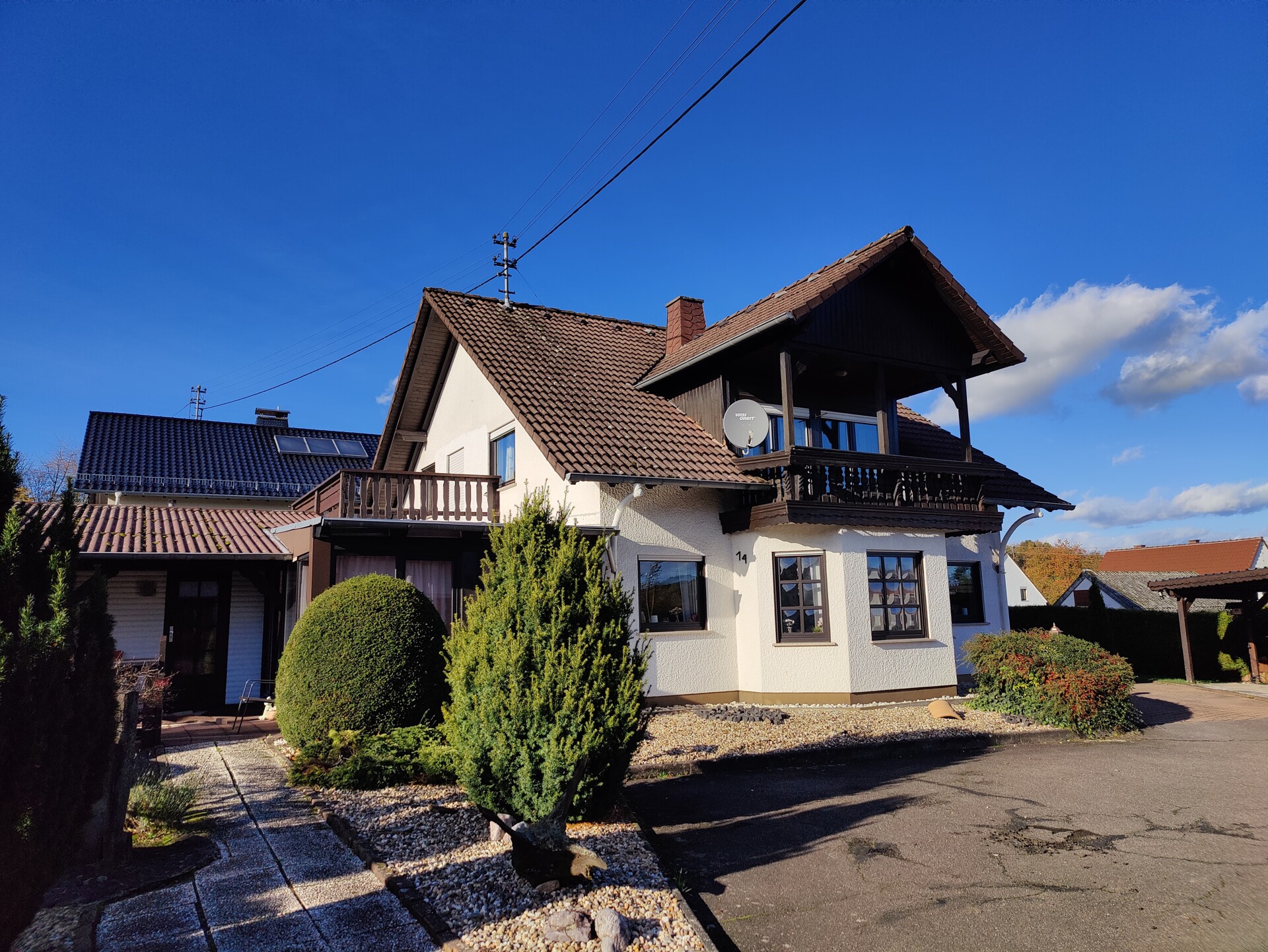 Über eine gemeinsame Zufahrt mit dem Nachbarhaus gelangt man zum Haupthaus sowie zu den beiden Garagen.