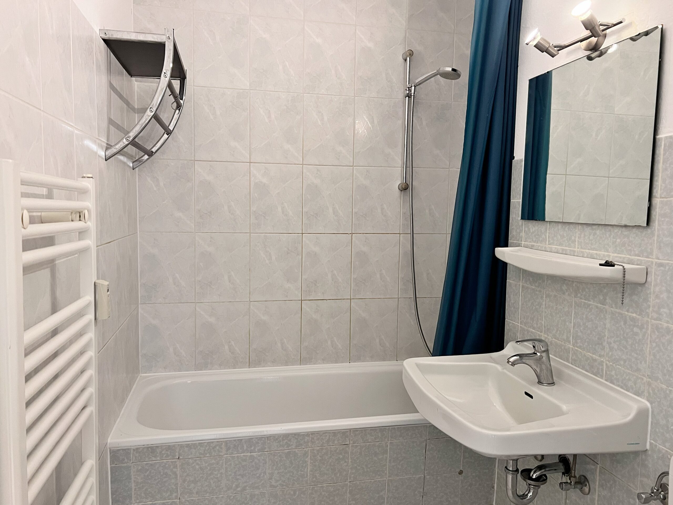 Vom kleinen Flur betritt man auch den optimal nutzbaren Abstellraum sowie das sanierte Bad. Dieses ist mit einer Wanne, einem Waschtisch und einem WC ausgestattet.