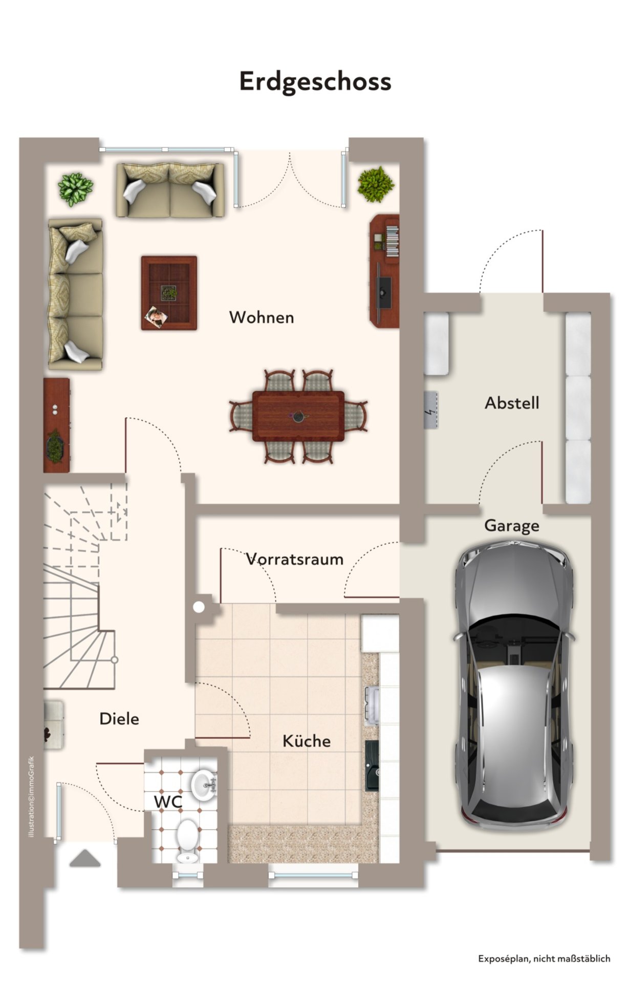 Im Erdgeschoss befinden sich ein einladender Eingangsbereich mit Gäste-WC, eine Küche mit angrenzendem Vorratsraum sowie ein großzügiges Wohnzimmer mit breiter Fensterfront und direktem Zugang zur Terrasse und in den Garten.