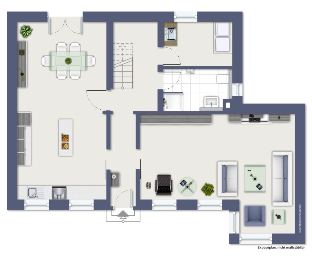 Zentraler Treffpunkt des Hauses ist die ca. 30 m² große Wohnküche mit einer exklusiven Einbauküche und Miele-Geräten – offen, elegant und perfekt für gemeinsames Kochen und Leben. Ein Hauswirtschaftsraum im Erdgeschoss ergänzt das durchdachte Raumangebot sinnvoll.