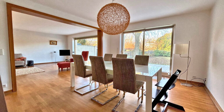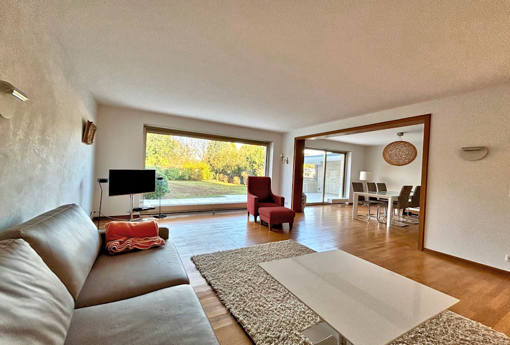 Im EG befindet sich der freundliche, helle und großzügige Eingangsbereich, ein Badezimmer mit Tageslicht, sowie das Wohnzimmer, das Esszimmer, jeweils mit schönem Ausblick auf die Terrasse und in den Garten sowie ein Schlaf-, Arbeits- oder Wohnzimmer.