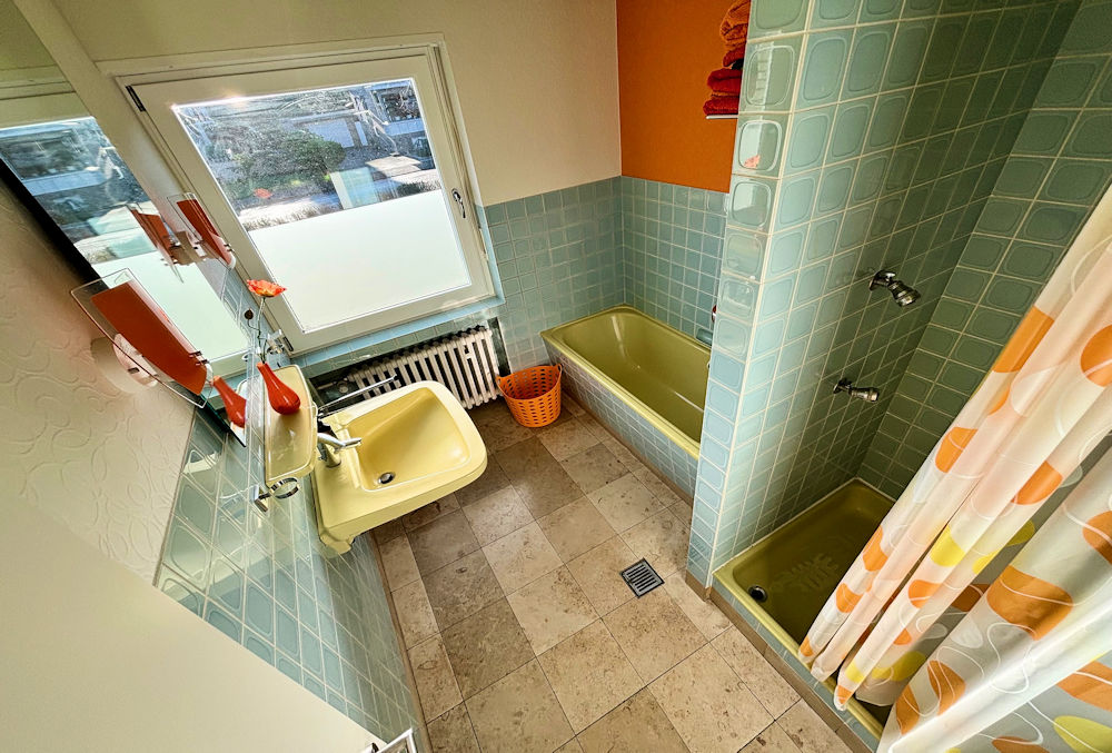 - Badausstattung: Dusche, Badewanne, Fenster im Badezimmer