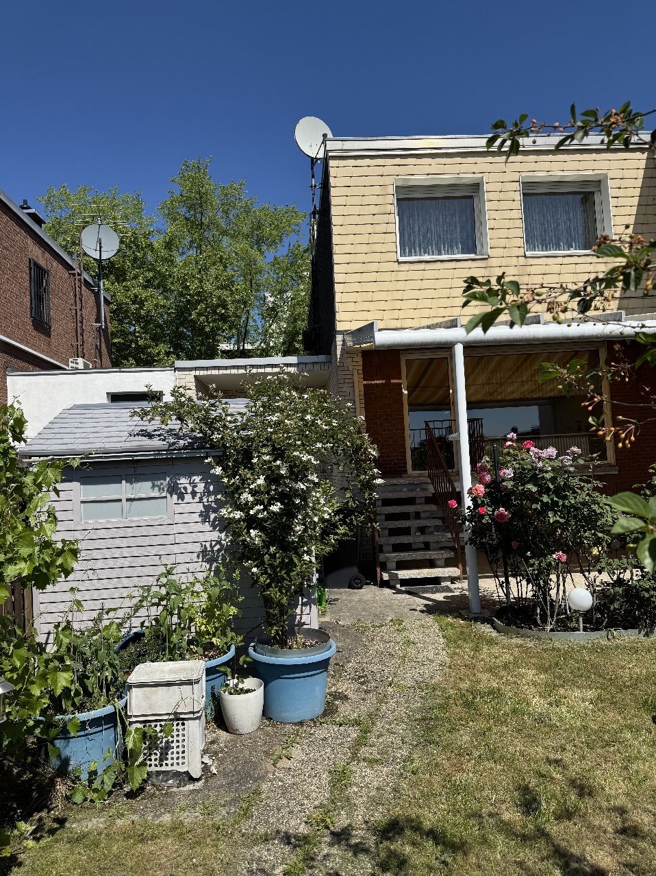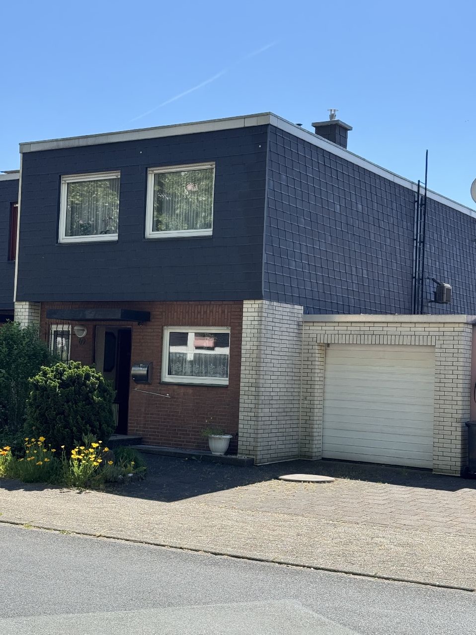 Über die große, überdachte Terrasse (Bj. 2010) gelangt man über eine Treppe in den ansprechenden, vorhandenen Garten. Ein praktisches, abschließbares Gartengerätehaus ist ebenfalls vorhanden. Die Garage befindet sich im einseitigen Bauchwich- ist vollunterkellert und verfügt über einen Gartenaustritt. Die Fassadenflächen im Erdgeschoss sind insgesamt verklinkert und im Obergeschoss mit Hartfaserzementplatten verkleidet. Die Giebelflächen wurden nachträglich gedämmt und mit Kunststoffpaneelen in Ziegeloptik verkleidet.