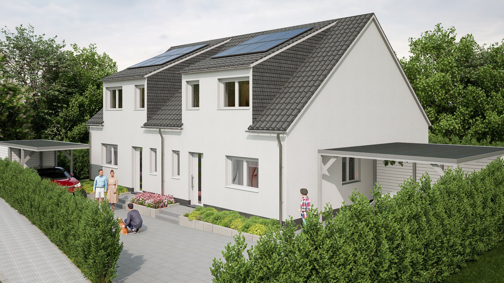 Anstelle eines klassischen Kellers sind praktische Außenabstellräume vorgesehen. Sie bieten Platz für Fahrräder, Gartengeräte oder saisonale Gegenstände. Zu jeder Doppelhaushälfte gehört außerdem ein eigener Kfz Außenstellplatz direkt am Haus.