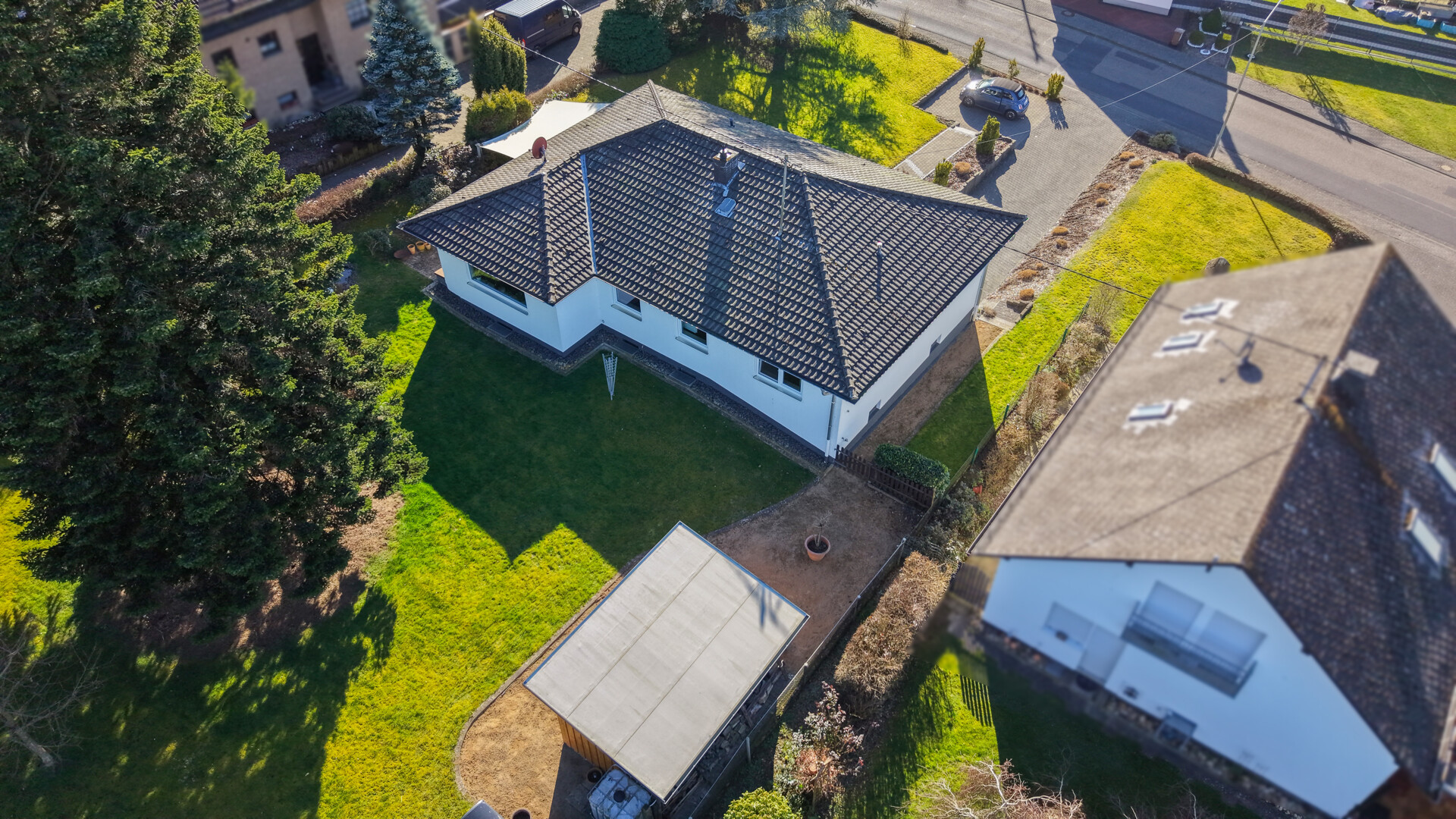 Dieser charmante Bungalow bietet komfortables Wohnen mit insgesamt fünf gut geschnittenen Zimmern. Bereits beim Betreten empfängt Sie eine große Diele, die einen einladenden Eingangsbereich schafft. Das Raumangebot umfasst ein Schlafzimmer, ein separates Gästezimmer sowie eine Ankleide und ein Arbeitszimmer. Ergänzt wird der Grundriss durch eine helle Küche mit angenehmer Atmosphäre, ein Badezimmer sowie ein zusätzliches Gäste-WC für Komfort im Alltag. Herzstück des Hauses ist das großzügige und lichtdurchflutete Wohn- und Esszimmer mit direktem Zugang zur Terrasse und dem beeindruckenden Grundstück. Die große Gartenfläche eröffnet vielfältige Gestaltungsmöglichkeiten und bietet viel Raum für Erholung, Freizeit und Naturgenuss. Der Bungalow ist voll unterkellert und bietet dadurch umfangreiche Nutzflächen. Im Untergeschoss befinden sich die Garage, eine Waschküche, ein Hobbyraum mit integrierter Bar sowie weitere Kellerräume mit viel Stauraum.