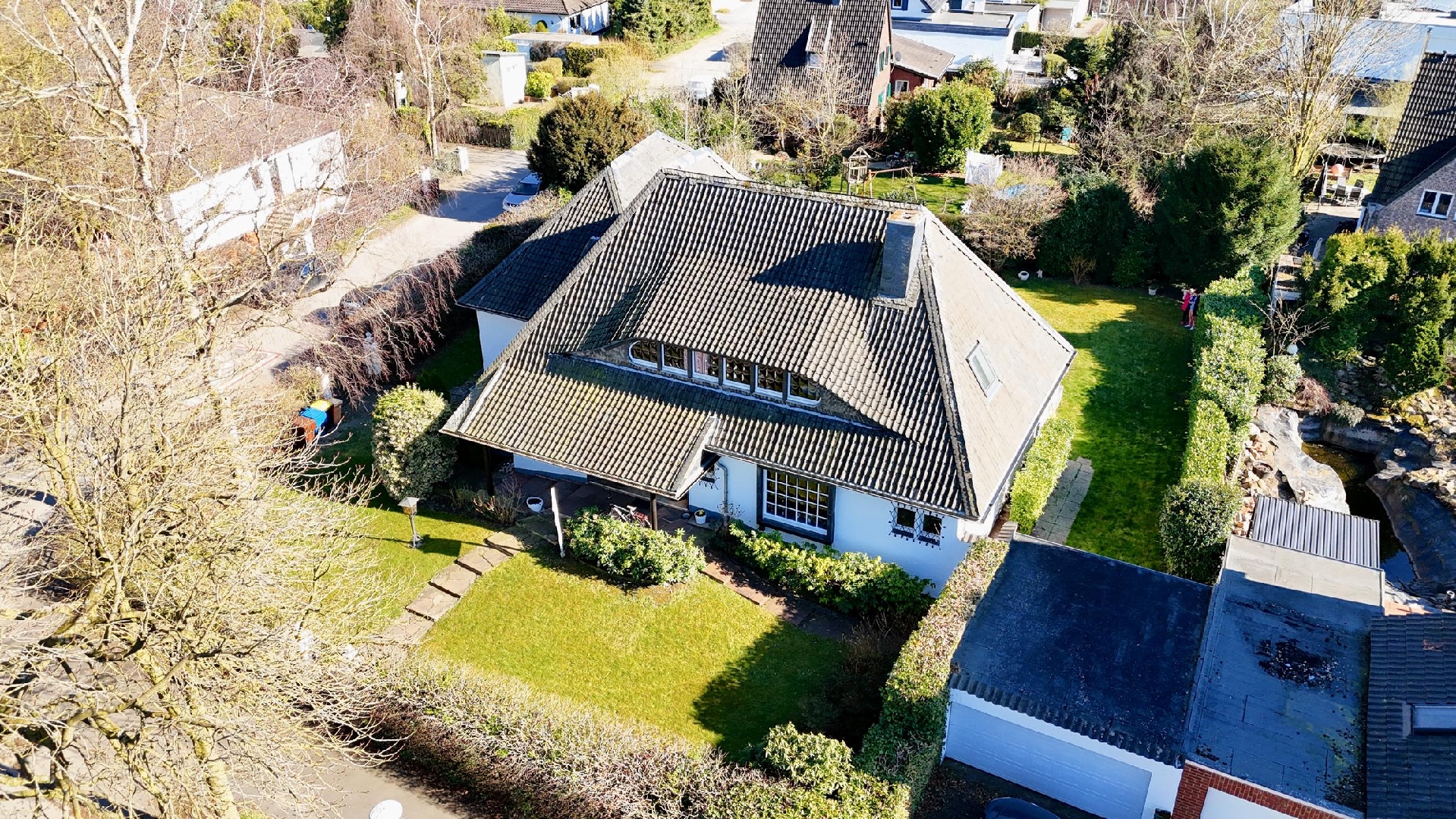 Durch die geschickte Platzierung des L-förmigen Gebäudes auf einer leichten Anhöhe, mittig des Grundstücks, entsteht eine elegante Grundstücksstruktur. Der großzügige Vorgarten mit altem Baumbestand, charmantem Eisentor und einer dichten Hecke bildet ein repräsentatives Entree. Zur Rechten des Wohnhauses befinden sich eine geräumige Doppelgarage mit Sektionaltor und zwei davorliegende PKW-Stellplätze. Ein weiteres Tor in der nordöstlichen Grundstückseinfriedung ermöglicht einen zusätzlichen Weg das Grundstück zu betreten oder zu befahren. Von hier aus ist auch die Garage im Kellergeschoss erreichbar. Der stets sehr gepflegte Garten ist südlich ausgerichtet und wenig einsehbar.