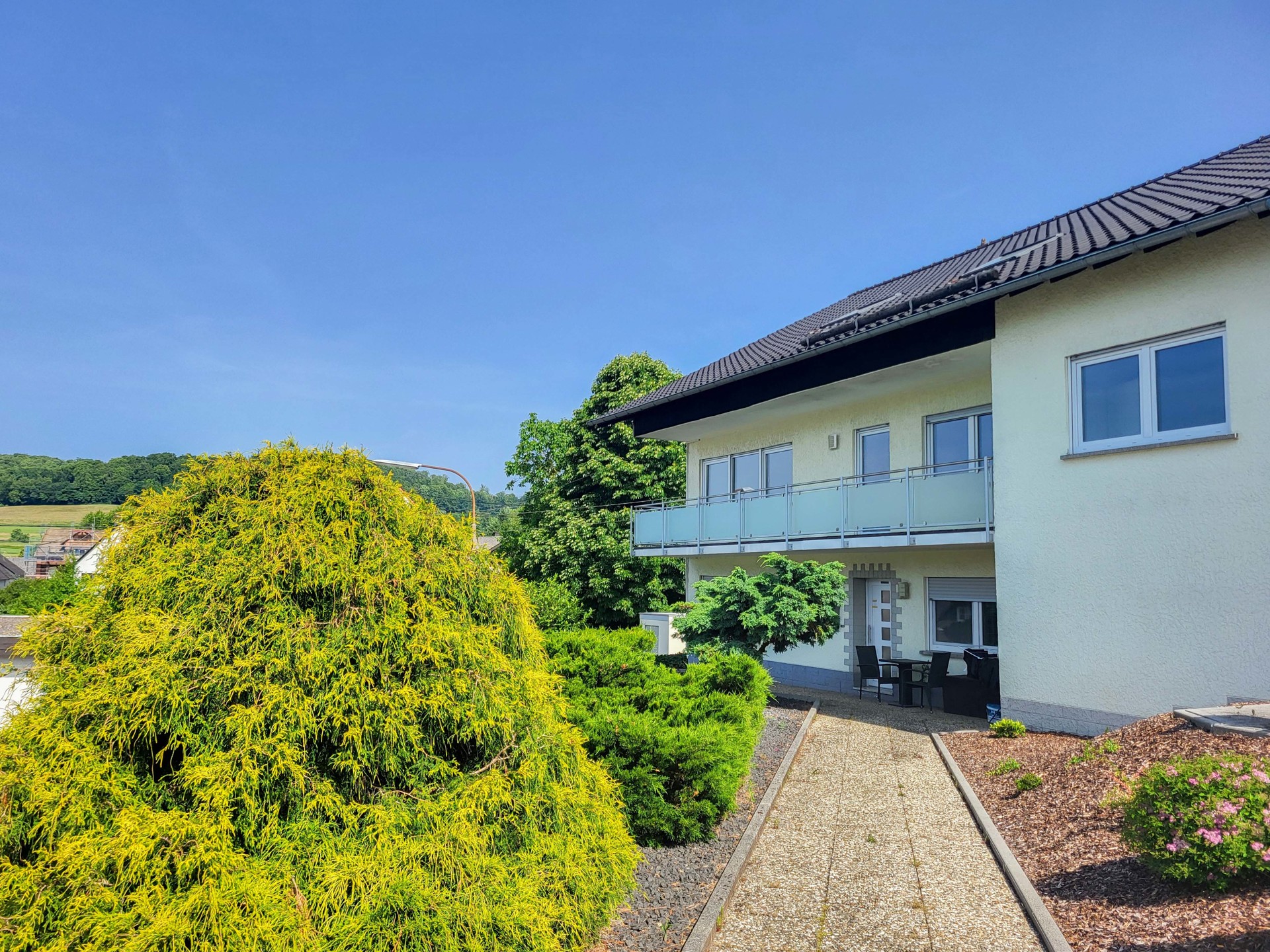 Jede der drei Wohneinheiten verfügt über einen separaten Eingang und eine eigene Garage sowie Terrasse bzw. Balkon. Die Gesamtwohnfläche beträgt ca. 343 m².