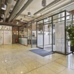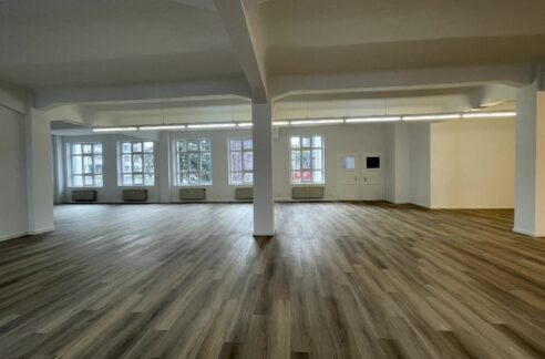 Diese großzügige Bürofläche umfasst ca. 405 m² und befindet sich im Erdgeschoss eines beeindruckenden, denkmalgeschützten Gebäudes aus dem Jahr 1895. Die Einheit besticht durch ihre moderne Ausstattung und die Helligkeit, die durch große Fenster auf beiden Seiten gewährleistet wird, was für eine angenehme Arbeitsumgebung sorgt.