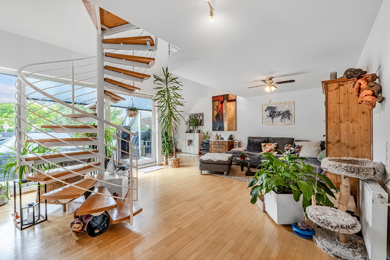 Eine filigrane Wendeltreppe führt ins Galeriegeschoss. Hier beeindruckt besonders der offene Galeriebereich mit Blick in das darunterliegende Geschoss – die großzügige Deckenhöhe und der Lichteinfall schaffen ein luftiges, beinahe loftartiges Wohngefühl. Das Galeriegeschoss beherbergt ein geräumiges Elternschlafzimmer mit praktischen Einbauschränken sowie ein Tageslichtbad mit Dusche und Eckbadewanne. Ein weiterer, ursprünglich als Kinder- oder Gästezimmer geplanter Raum wird als private Sauna und Ruhezone genutzt. Ein Rückbau zur Nutzung als Büro oder Kinderzimmer ist auf Wunsch ohne großen Aufwand möglich. Von hier aus gelangen Sie direkt auf den zweiten, uneinsehbaren Balkon mit weitem Blick ins Grüne. Ein Rückzugsort mit echter Wellness-Qualität. Ein kleiner Abstellraum in der Dachschräge komplettiert die Wohneinheit.