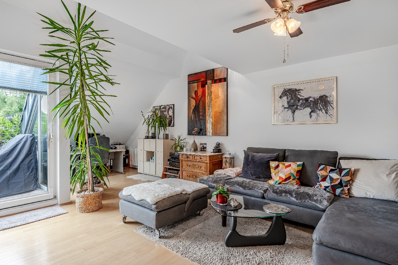 Diese Maisonette-Wohnung erstreckt sich über das 2. Obergeschoss sowie das ausgebaute Galeriegeschoss einer gepflegten Wohnanlage am Rande eines Naturschutzgebiets. Mit einer Wohnfläche von ca. 107 m², zwei Balkonen, einer beeindruckenden Raumhöhe durch die offene Galerie und einer hochwertigen Ausstattung bietet diese Immobilie außergewöhnlichen Wohnkomfort – sowohl für Kapitalanleger als auch für Eigennutzer mit Anspruch. Der Zugang zur Wohnung erfolgt über das 2. Obergeschoss. Hier eröffnet sich ein großzügiger Wohnbereich mit Zugang zum großen Balkon in Westausrichtung. Über ein großes Schiebetürelement gelangen Sie ins Freie. Die Küche und der Essplatz sind durch eine elegante Glasschiebetür vom Wohnraum separiert. Die moderne Einbauküche wurde erst im vergangenen Jahr von