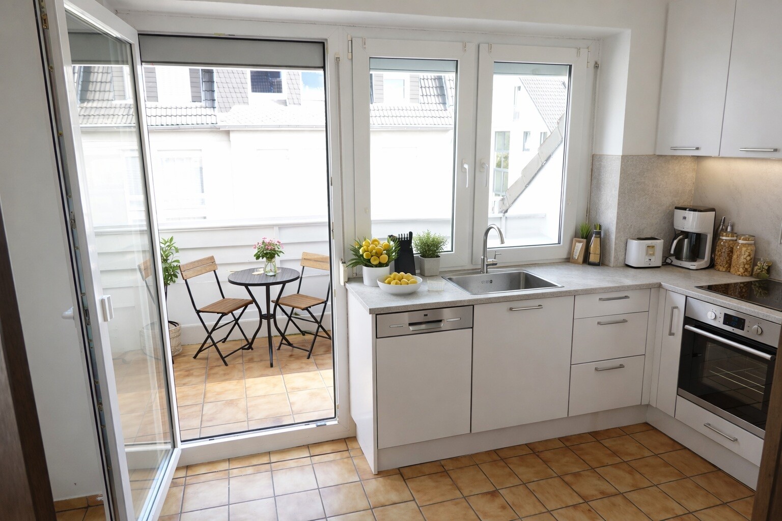 Genießen Sie so morgens die ersten Sonnenstrahlen beim Frühstück auf den beiden nach Südosten ausgerichteten Loggien. Am Abend lädt die Sonne Sie auf den beiden Südwest-Loggien zum Verweilen ein, eine davon sogar mit eleganter Glasüberdachung, sodass Sie auch bei wechselhaftem Wetter geschützt draußen sitzen können. Durch die Lage im Dachgeschoss genießen Sie zudem einen herrlichen Ausblick.