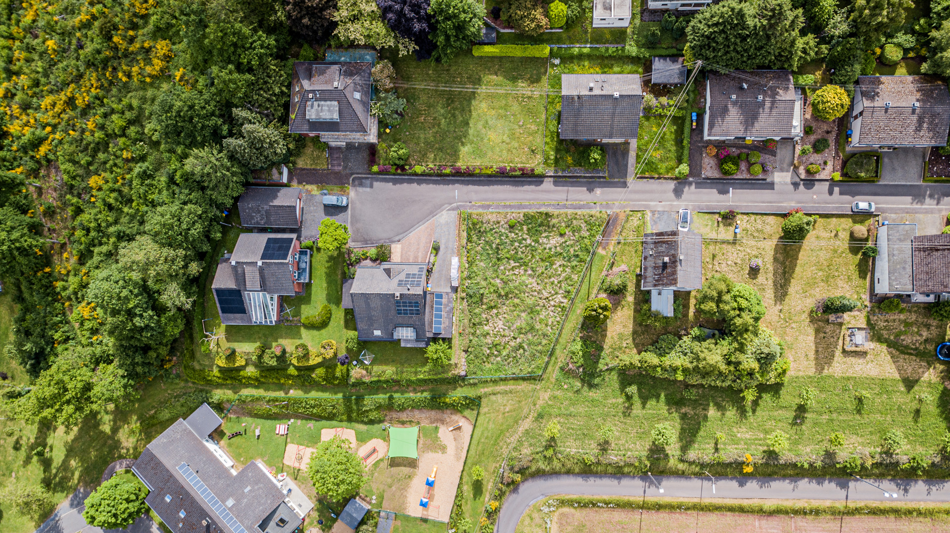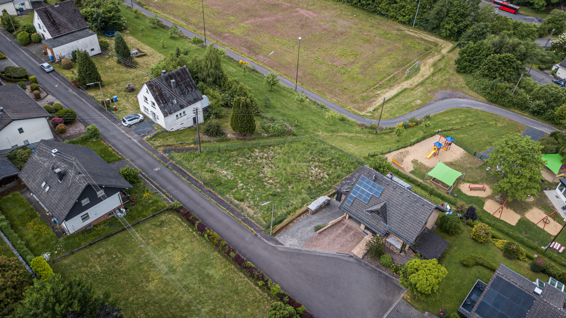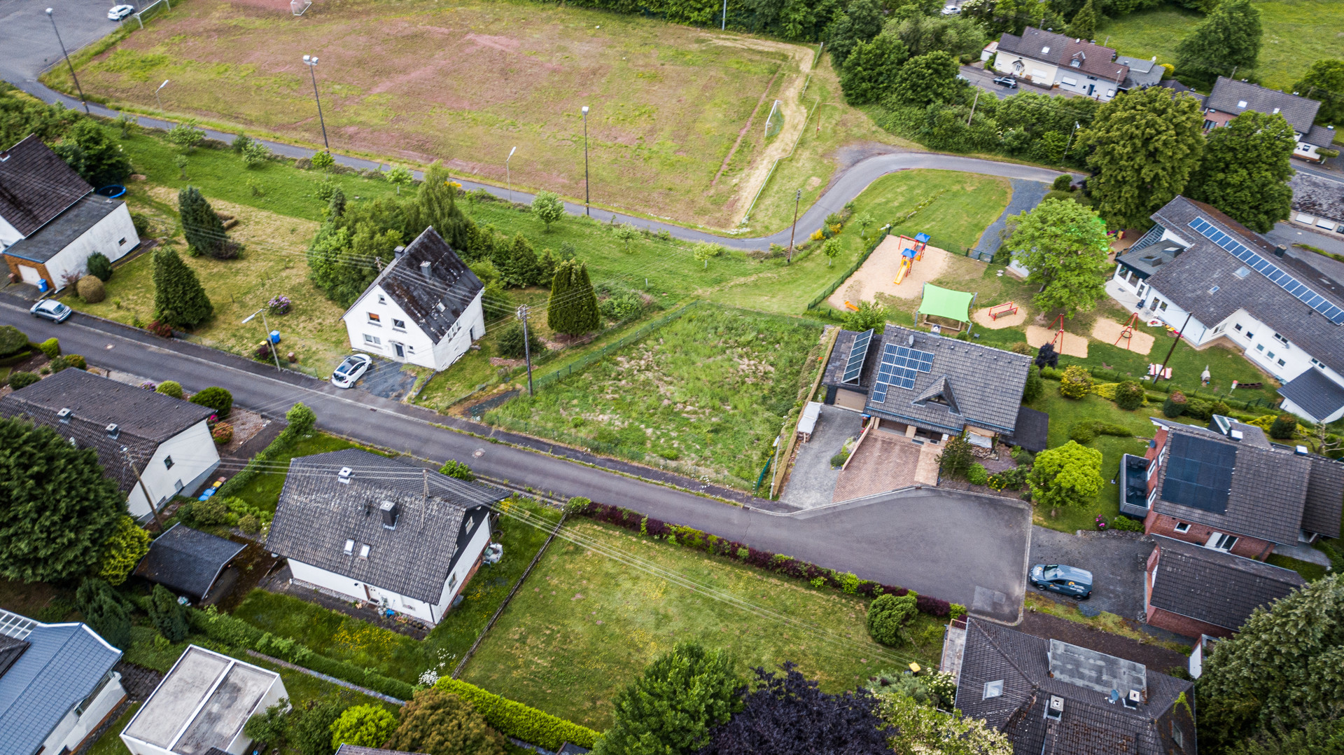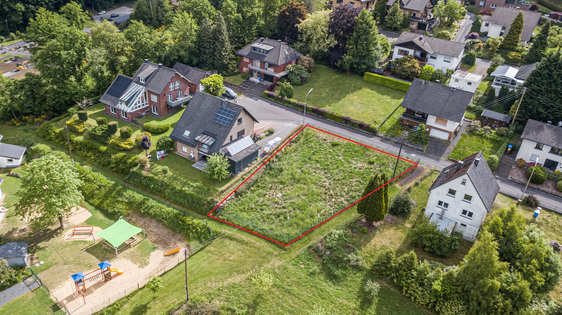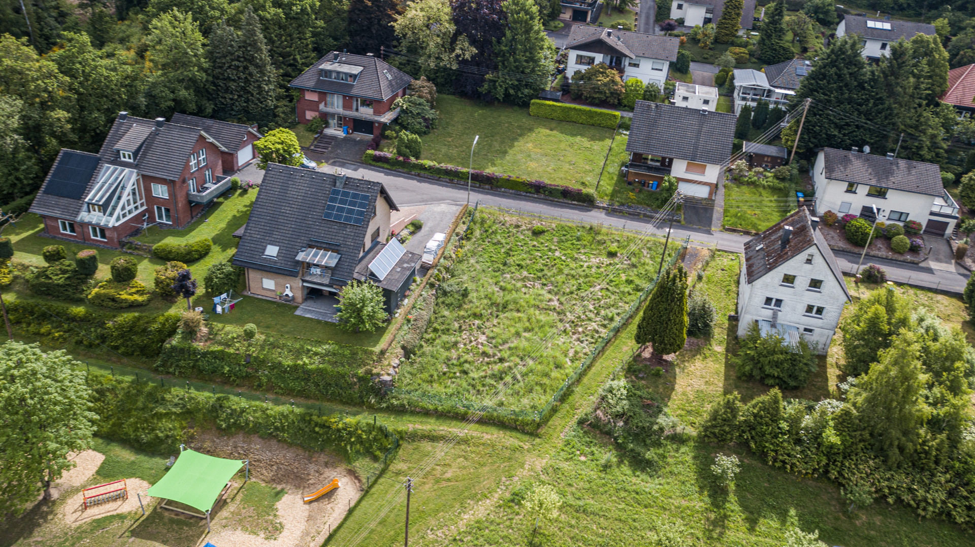 Das Grundstück in Steinebach/Sieg befindet sich in einem ruhigen und grünen Wohngebiet am Ende einer Sackgasse, direkt vor dem Wendehammer. Es liegt auf einer Anhöhe und bietet einen schönen Fernblick. Die Umgebung zeichnet sich durch eine ländliche Idylle mit angrenzenden Wiesen und Feldern aus.