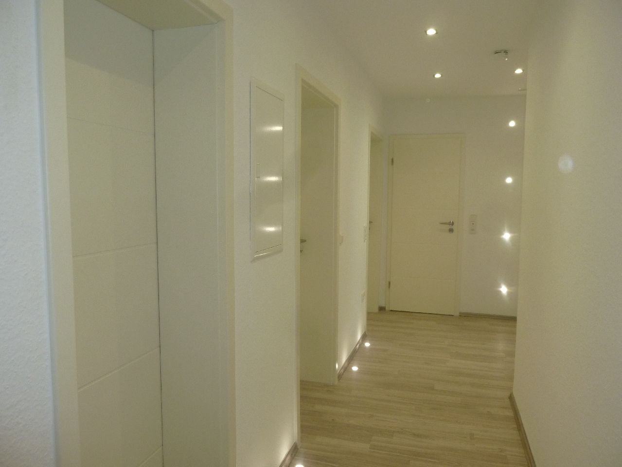 Renoviert, Flur und Bad mit abgehängter Decke und Niedervoltbeleuchtung, helles Laminat, LED-Fußboden-/und Wandbeleuchtung im Flur, Thermopenfenster, Gastherme.
