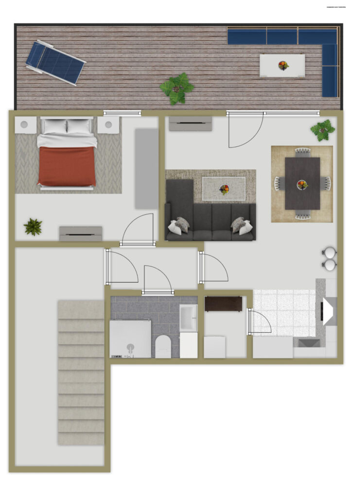 Ein besonderes Highlight ist die großzügige Dachterrasse, die direkt vom Wohnbereich zugänglich ist. Sie bietet Ihnen einen privaten Rückzugsort unter freiem Himmel, an dem Sie sonnige Stunden genießen oder den Feierabend entspannt ausklingen lassen können.