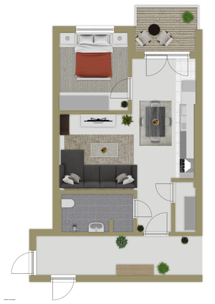 Die Wohnung selbst überzeugt durch einen durchdachten Grundriss, der das Wohnen leicht und klar strukturiert erscheinen lässt. Der offene Wohn-, Ess- und Kochbereich bildet das Herzstück – hell, einladend und ideal auf die Bedürfnisse moderner Lebensstile zugeschnitten. Die Küche lässt sich dezent integrieren, während im Essbereich genug Platz für gemeinsame Abende oder ein ruhiges Frühstück am Wochenende bleibt.